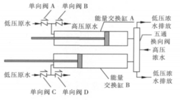 低壓原水從單向閥 A 或單向閥 C 進入能量回收裝置,充滿能量交換缸 A 或 能量交換缸 B;高壓濃水從五通換向閥進入能量回收裝置,當五通換向閥使高  壓濃水與能量交換缸 A 連通時,高壓濃水將能量傳遞給低壓原水,實現能量交 換,高壓原水從單向閥 B 進入反滲透膜壓力容器進行脫鹽處理;待將能量交換 缸 A 中的原水全部加壓送至反滲透系統后,五通換向閥,將高壓濃水與能量交 換缸 B 連通,重復上述能量交換過程,同時能量交換缸 A 中低壓原水進入,排 出低壓濃水。兩個能量交換缸交替進行高壓濃水與低壓原水的能量交換,實現  將低壓原水連續增壓送至反滲透系統進行脫鹽處理。