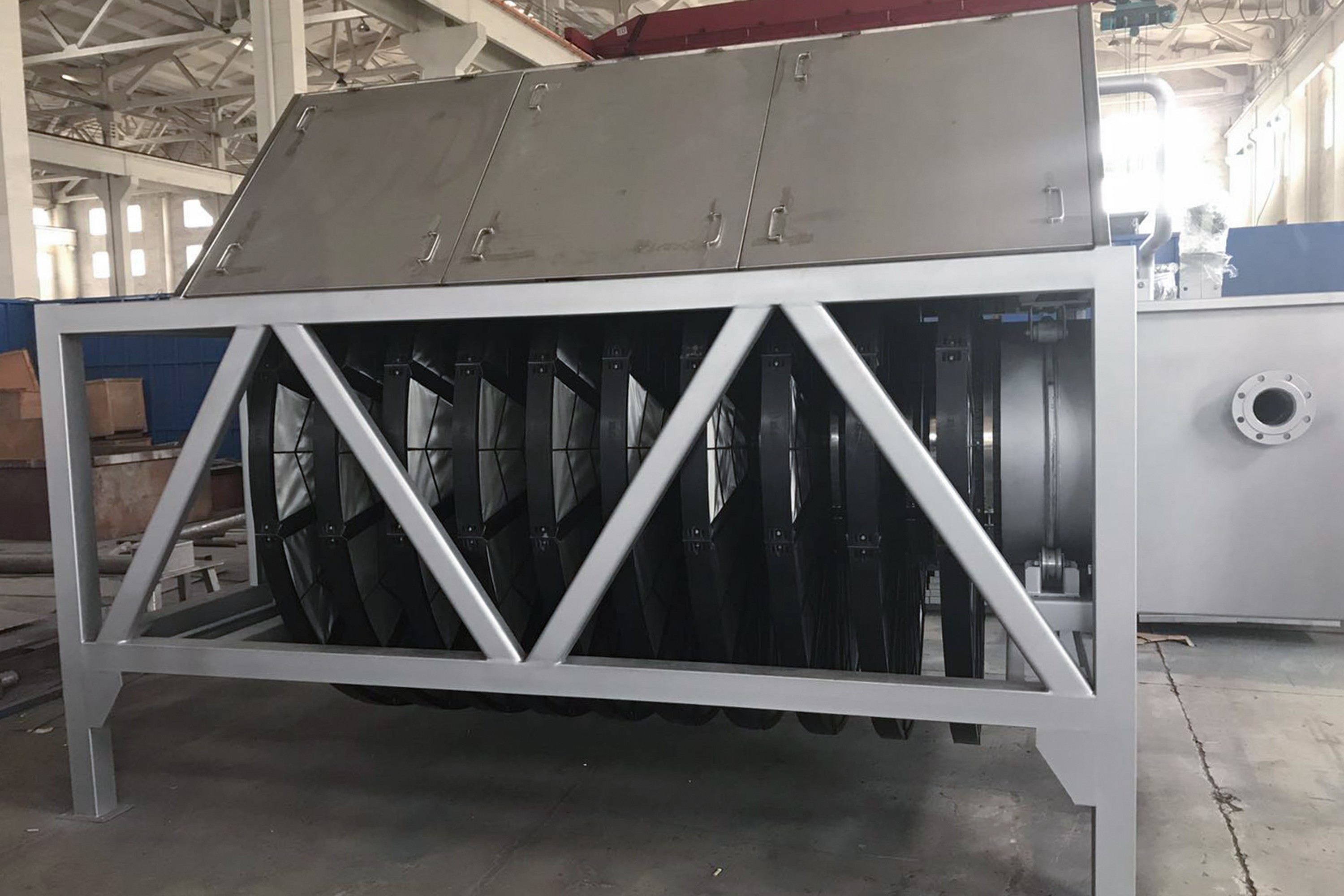 濾布濾池:該系統包括混泥土池體、進水堰箱、出水可調堰板、支撐軸座、中空設備主體(等邊六角形或者圓形)、纖維濾盤、支撐滑輪、出水口密封組件、排污系統、驅動裝置、自動化控制系統。設備主體端部與支撐軸座法蘭連接,出水管置于支撐滑輪上,并安裝出水密封組件;纖維濾盤垂直安裝在設備主體上;濾盤內部設有骨架,用于支撐包裹在外面的濾布,骨架中空,并與設備主體連接固定后形成一個外部密封,內部中空的整體;排污系統包括池底排污和濾盤反洗,每個濾盤的兩側設有反抽吸裝置。運行時,污水經過進水堰箱,均勻進入濾池,由外向內通過濾盤,由濾盤上的濾布截留污物后的凈水進入中空設備主體,然后排出池外。