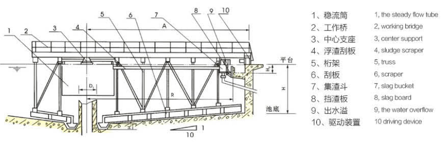?概述:GZB 型周邊傳動刮吸泥機適用于市政、造紙、化工、冶金、石油等行業的18cm 以上的沉淀池或濃縮池的污泥清除,是水處理的理想機械設備,其工作原理為周邊驅動橋架繞中心支座帶動刮泥板旋轉,將沉降池底的污泥刮到中心集泥坑排出,液面浮渣由刮泥板濃縮至集渣斗排出。
