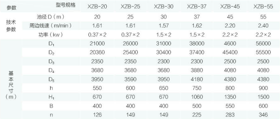XZB型吸泥機一般用于大型(一般指流量大于500m3/h) 污水處理工程的幅流式沉淀池,特別適用于二沉池池底污 泥的刮集及外排。池形一般采用中心進水、周邊出水、中 心排泥,池底可不設坡度(平底結構),二沉池使用尤為廣 泛。水面浮渣、浮沫等雜物可由浮渣刮集裝置刮排至池外 渣坑或渣斗。靜壓排泥依靠各個管口閥門,調節流量流至 中心泥缸直接外排。虹吸排泥主要是利用真空泵抽真空進 行二次虹吸提升排泥力矩變化范圍較大的場合,可采用帶力矩保護裝置的軸裝 式減速機。